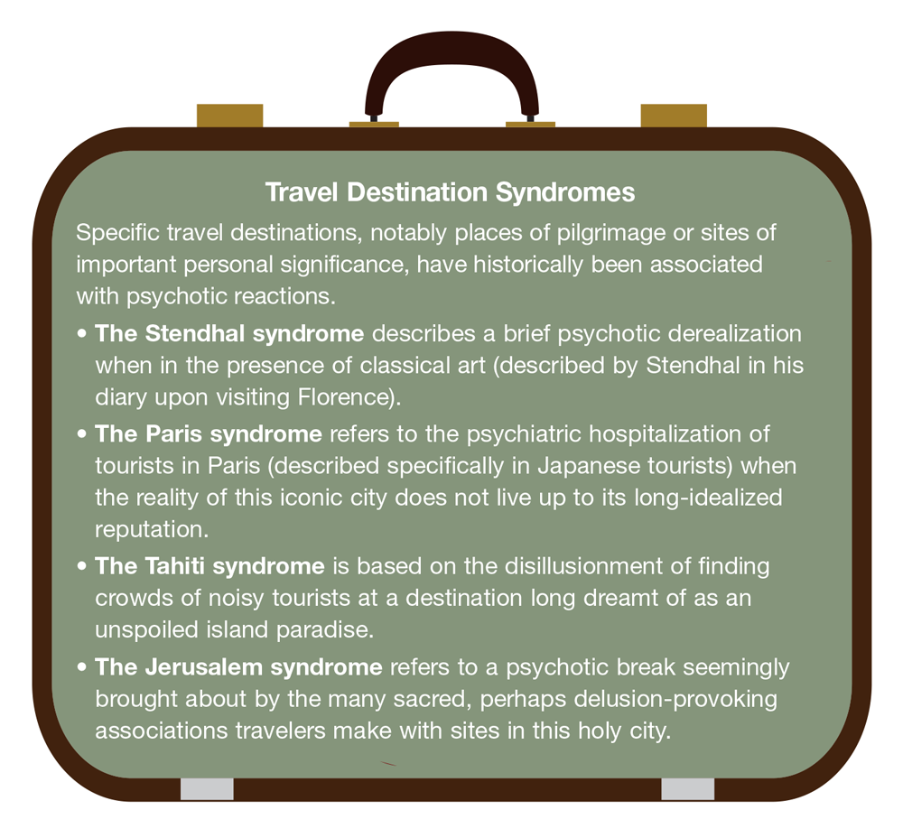 Travel can also mean separation from a special person, from one’s home, country, and culture. For a patient with long-standing mental illness, travel may mean distance for the first time from trusted care providers and health resources. Separation from attachment figures is known to be intensely anxiety-provoking for patients with preexisting psychosis. 6